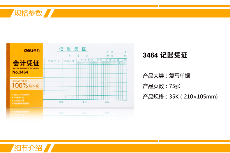 商品名称:得力(deli)35K会计记账凭证 3464 商品编号:101257 品牌:得力 上架时间:2021-06-25 商品毛重:0克