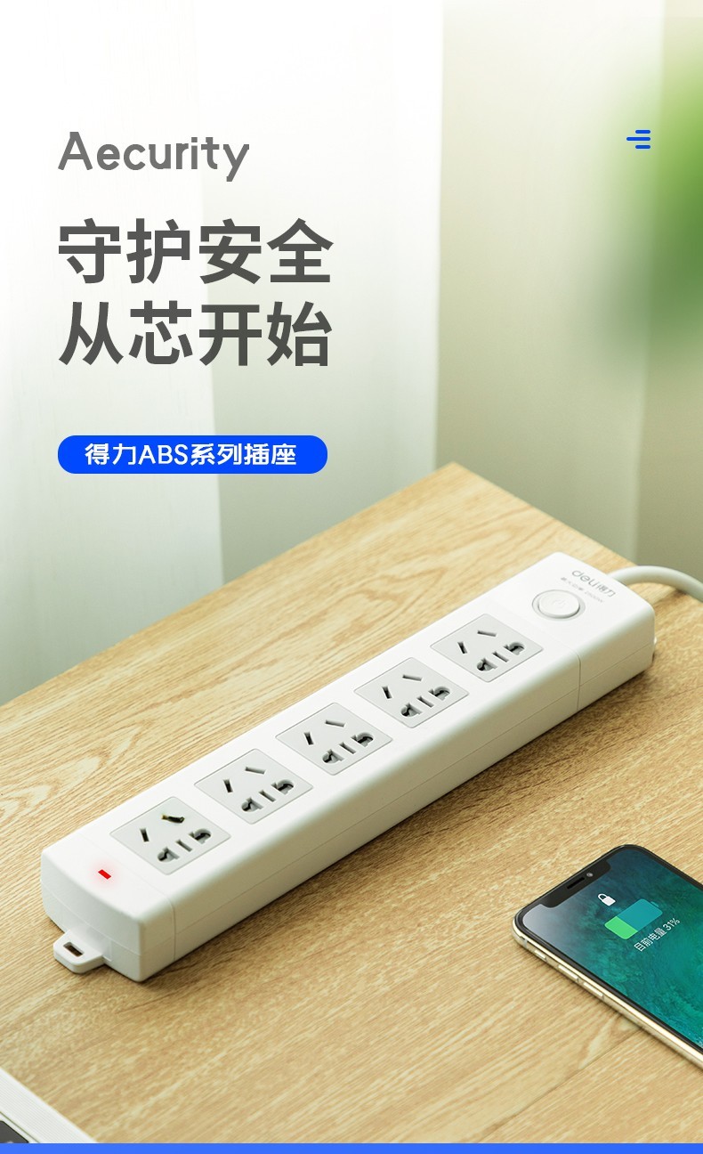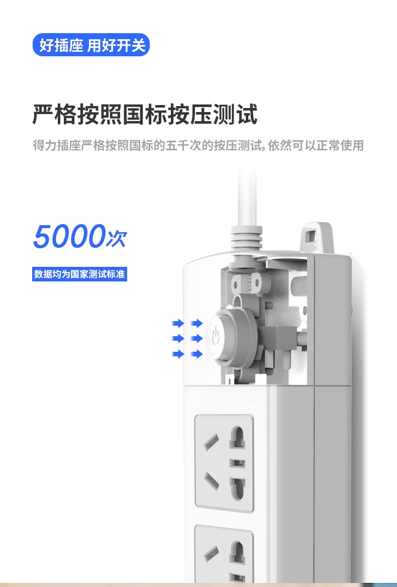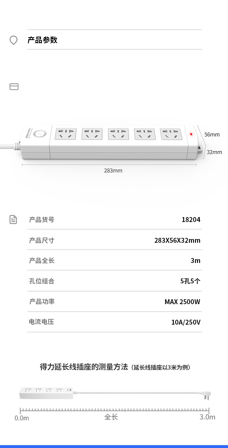 商品名称:得力(deli) 插座接线板18205(6孔3米) 商品编号:101791 品牌:得力 上架时间:2021-07-15 商品毛重:0克