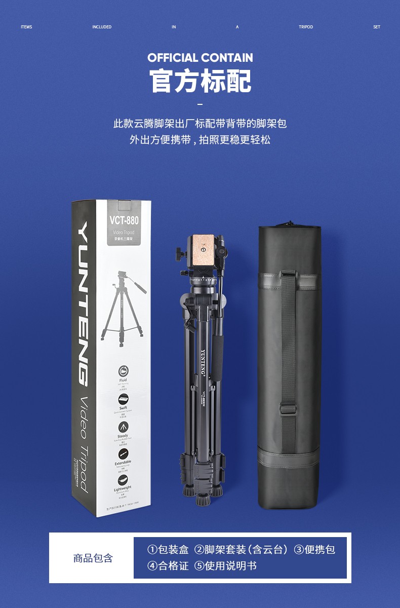 商品名称:云腾880专业摄像三脚架液压云台 商品编号:101954 品牌:云腾 上架时间:2021-07-21 商品毛重:0克