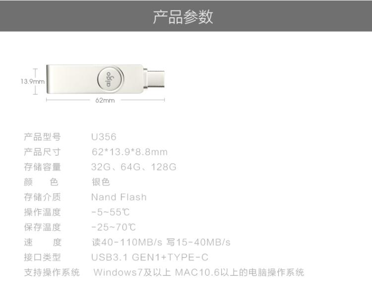 商品名称:爱国者优盘 USB3.1 TYPE-C手机U盘 U356-128GB 商品编号:102037 品牌:爱国者 上架时间:2021-07-22 商品毛重:0克