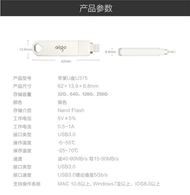 商品名称:爱国者优盘 苹果U盘U375-256GB(银) 商品编号:102046 品牌:爱国者 上架时间:2021-07-22 商品毛重:0克