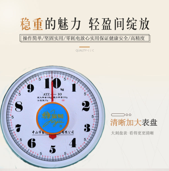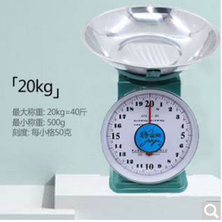商品名称:妙洁 盘称20公斤家用指针称托盘秤10老式家庭厨房卖菜圆盘称商用弹簧称wys 20kg圆盘 商品编号:182574 品牌:妙洁 上架时间:2021-08-11 商品毛重:0克