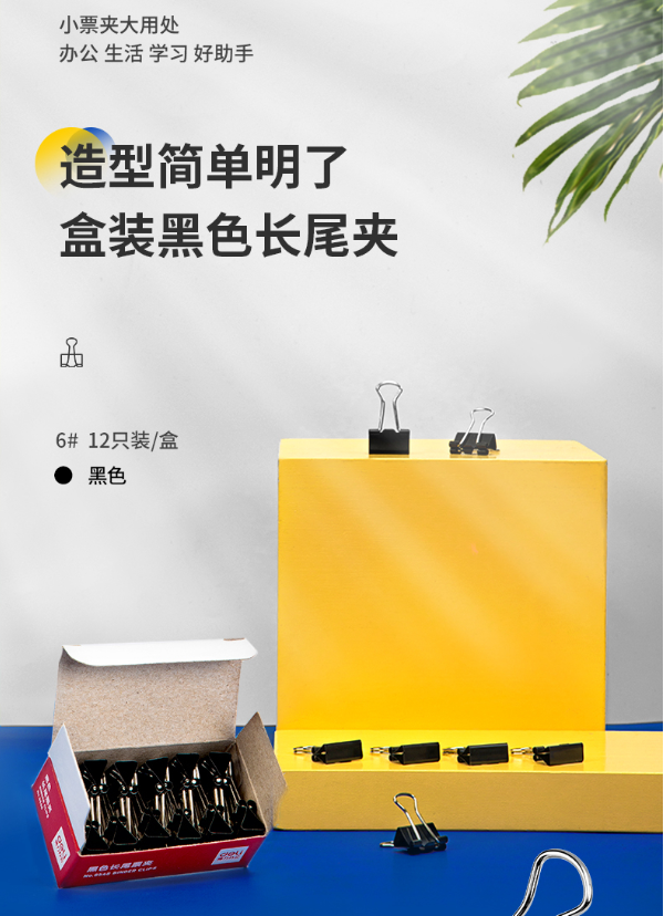 商品名称:得力9546-6#15mm长尾票夹黑色盒装(12只/盒) 商品编号:182698 品牌:得力 上架时间:2021-08-17 商品毛重:0克