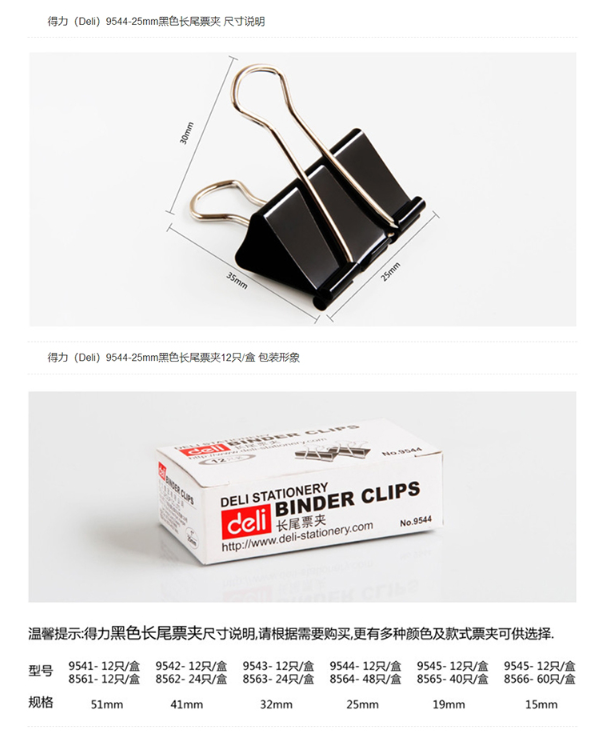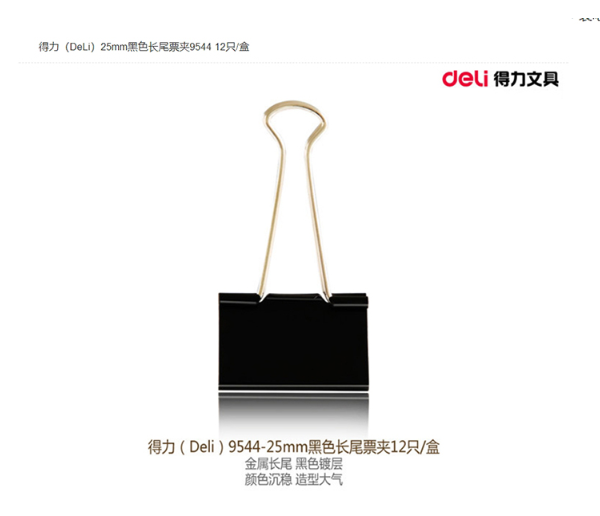 商品名称:得力(deli)25mm中号金属黑色长尾夹 12只/盒 商品编号:182708 品牌:得力 上架时间:2021-08-17 商品毛重:0克