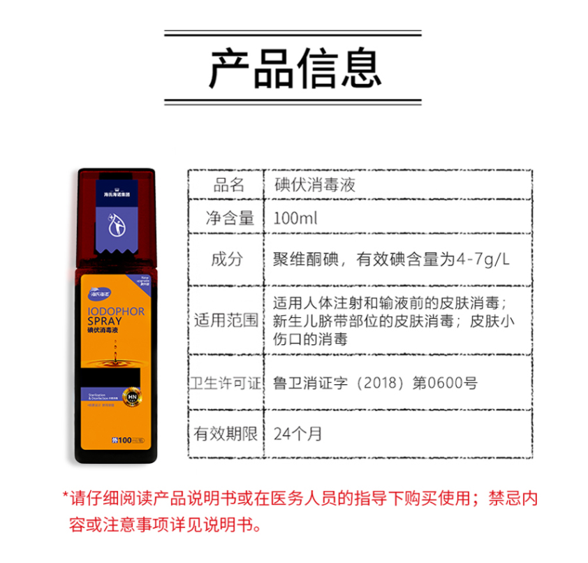 商品名称:海氏海诺 医用碘伏消毒液喷雾剂 皮肤伤口消毒 100ml(可用于新生婴儿肚脐带消毒液护理) 商品编号:182734 品牌:海氏海诺 上架时间:2021-08-17 商品毛重:0克