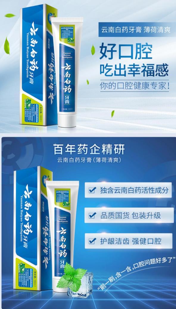 商品名称: 云南白药 牙膏 210g (薄荷清爽型) 商品编号:183135 品牌:云南白药 上架时间:2021-08-27 商品毛重:0克