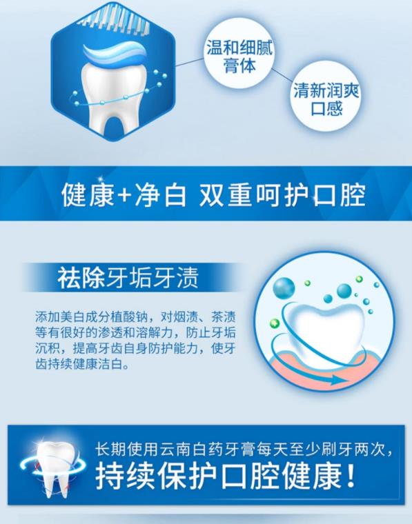 商品名称:云南白药牙膏 清新口气 健白护理 天然净白 冬青香型 165g 商品编号:183139 品牌:云南白药 上架时间:2021-08-27 商品毛重:0克