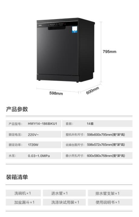 商品名称:海尔(Haier)洗碗机独嵌两用14套大容量餐具双微蒸汽洗智能开门烘干洗碗机 HWY14-186BKU1 商品编号:183150 品牌:海尔 上架时间:2021-08-27 商品毛重:0克