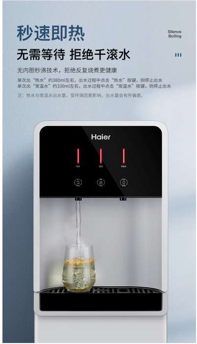 商品名称:海尔(haier)饮水机家用即热下置水桶立式自动上水办公室无胆温热多功能新款速热机 YR1979-JCB 商品编号:183429 品牌:海尔 上架时间:2021-09-04 商品毛重:0克