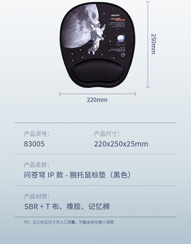 商品名称:得力(deli)舒适记忆棉腕托鼠标垫 办公鼠标垫 中国航天 黑色83005 商品编号:183468 品牌:得力 上架时间:2021-09-04 商品毛重:0克