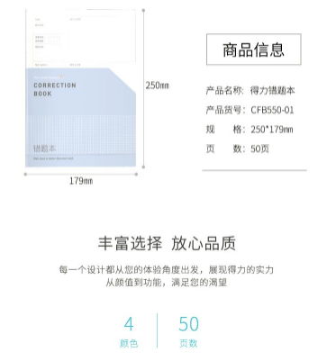 商品名称:得力错题本改错本 小学生本子纠错本笔记本 初中高中理科加厚大号数学纠错集 学霸笔记本 4本装(颜色随机) 商品编号:183475 品牌:得力 上架时间:2021-09-04 商品毛重:0克