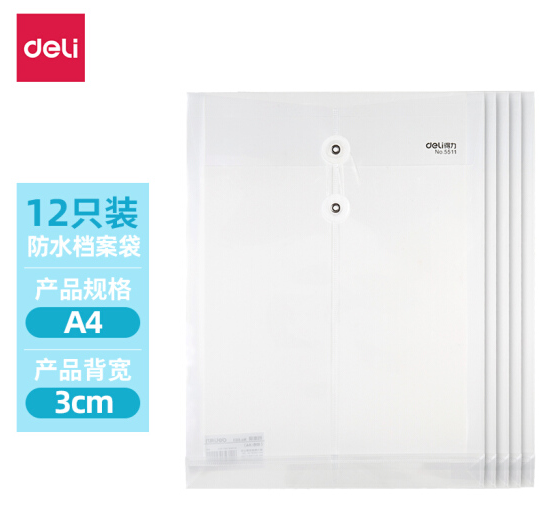 - 商品名称:得力(deli)12只A4加厚防水透明文件袋资料袋绕绳档案袋 绑带式票据试卷收纳袋 学科分类5511