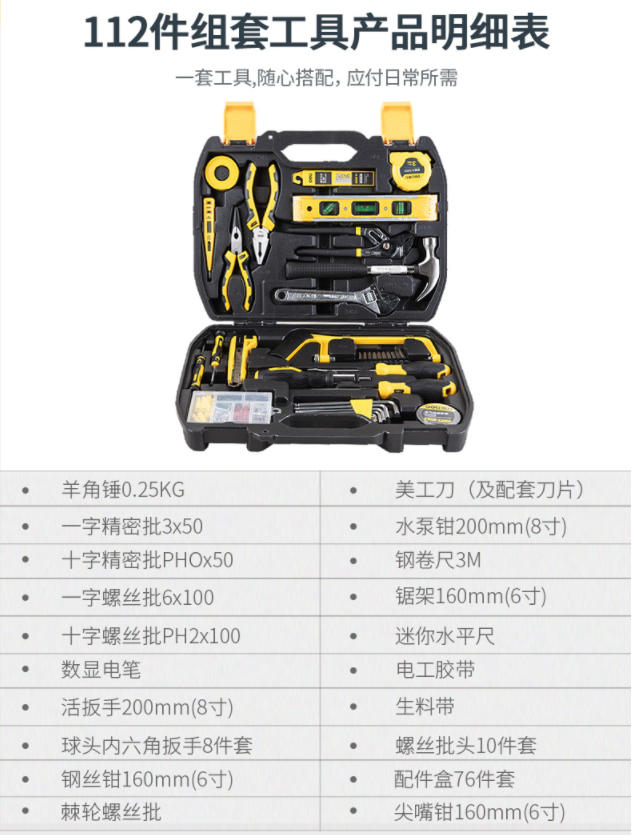 商品名称:得力(deli) DL5961 多用途家用五金工具套装综合维修工具组套8件套 商品编号:183677 品牌:得力 上架时间:2021-09-08 商品毛重:0克