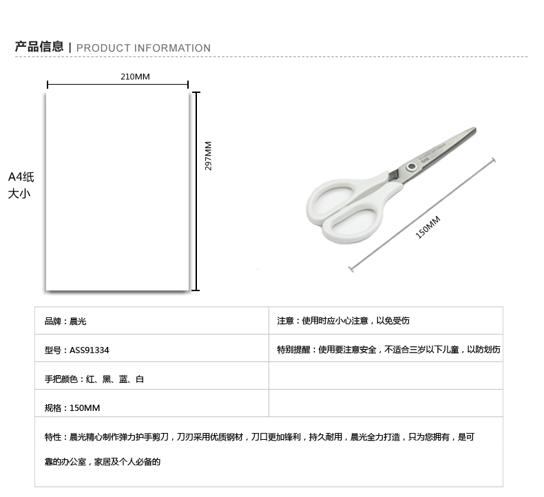 商品名称:晨光150mm剪刀办公ASS91334 商品编号:183748 品牌:晨光 上架时间:2021-09-09 商品毛重:0克