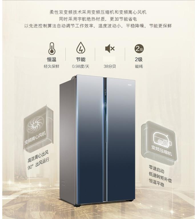 商品名称:海尔(Haier) BCD-601WDCE 冰箱 一级能效 变频 彩晶玻璃面板 渐变(布朗灰→深海蓝) 对开门 商品编号:184241 品牌:海尔 上架时间:2021-09-15 商品毛重:0克