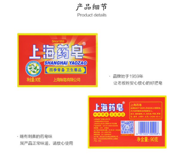 商品名称:*上海药皂 90g 1/块 商品编号:184438 品牌:上海药皂 上架时间:2021-09-18 商品毛重:0克