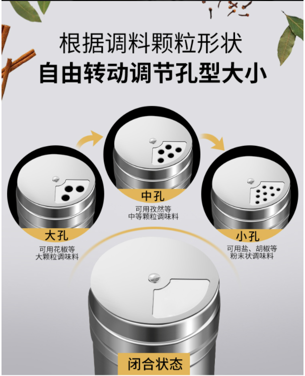 商品名称:尚烤佳 调料罐 调料瓶 不锈钢调味瓶 调味罐 厨房用品 烧烤工具配件 可调节大小孔 3只装 商品编号:184624 品牌:尚烤佳 上架时间:2021-09-24 商品毛重:0克