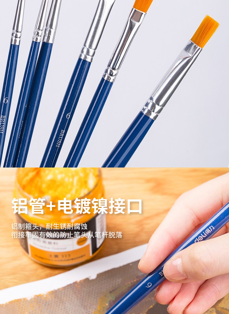 商品名称:得力(deli)6支装画笔套装 学生艺考手绘绘画专业级大师美术用品(水粉丙烯油画水彩颜料)画笔套装 73885 商品编号:184777 品牌:得力 上架时间:2021-09-28 商品毛重:0克
