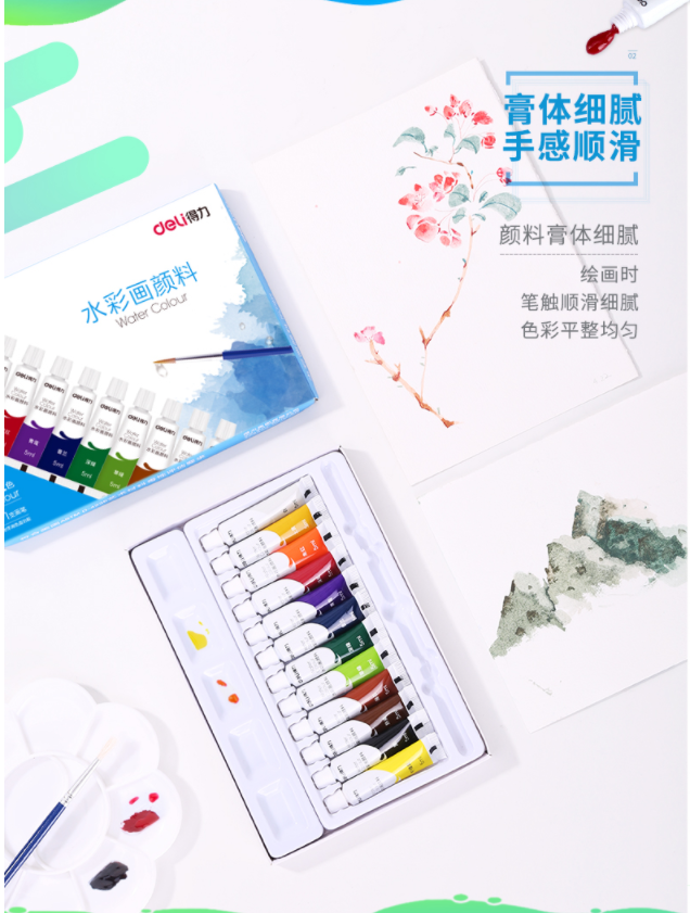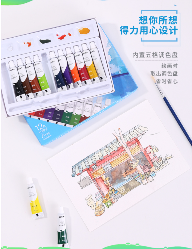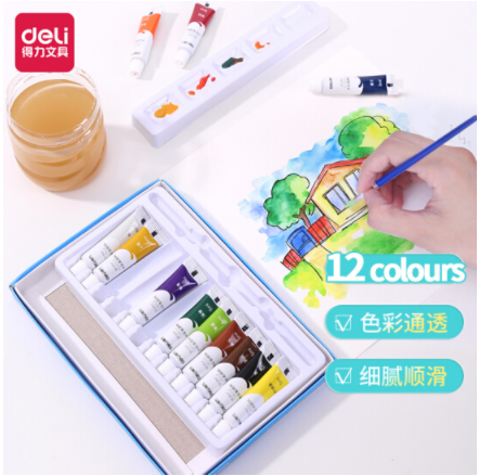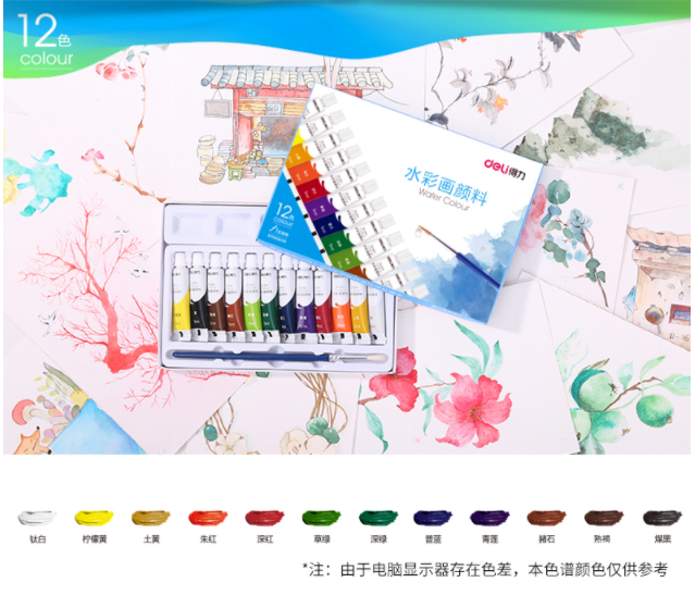 商品名称:得力(deli)水彩颜料 12色5ml套装便携学生儿童入门级画画美术专用绘画色彩文具(含毛笔调色格) 中考考试礼物73859 商品编号:184885 品牌:得力 上架时间:2021-09-29 商品毛重:0克