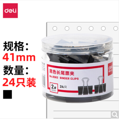 - 商品名称:得力(deli)24只41mm黑色长尾夹票夹 金属燕尾夹票据文件夹子 办公用品 大号8562