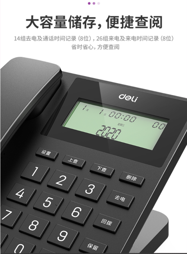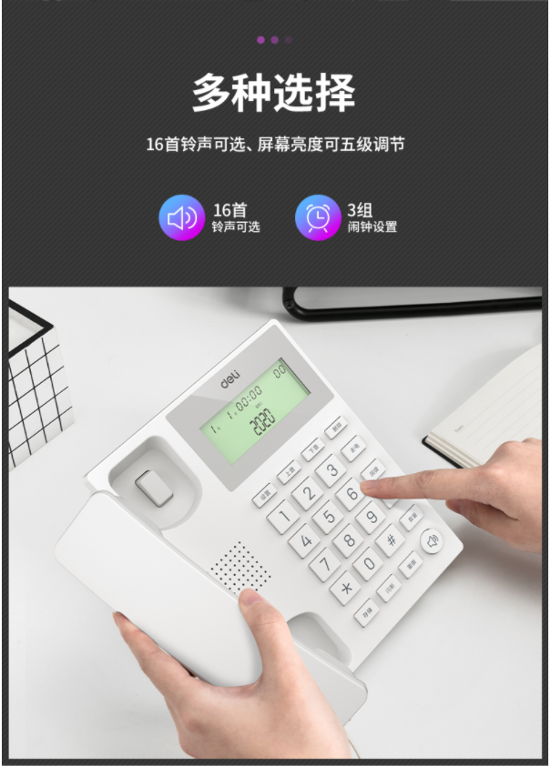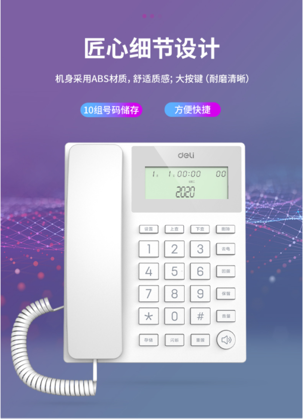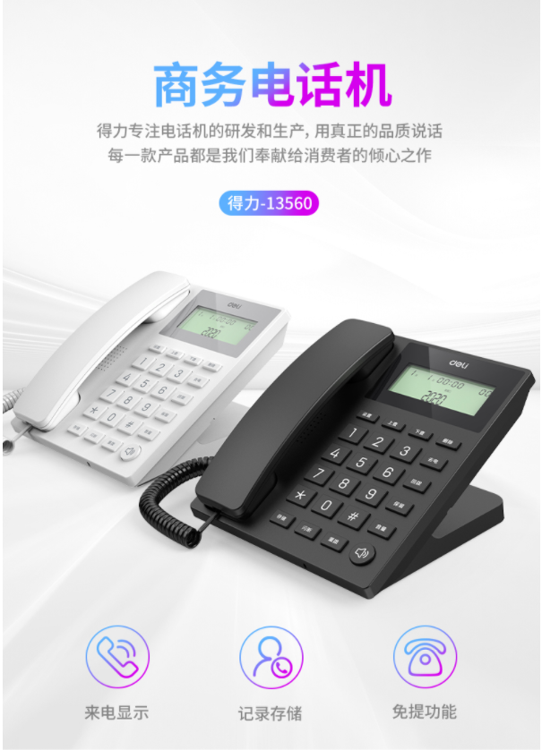 商品名称:得力(deli)电话机座机 固定电话 办公家用 45°倾角 亮度可调 13560白 商品编号:185178 品牌:得力 上架时间:2021-10-13 商品毛重:0克