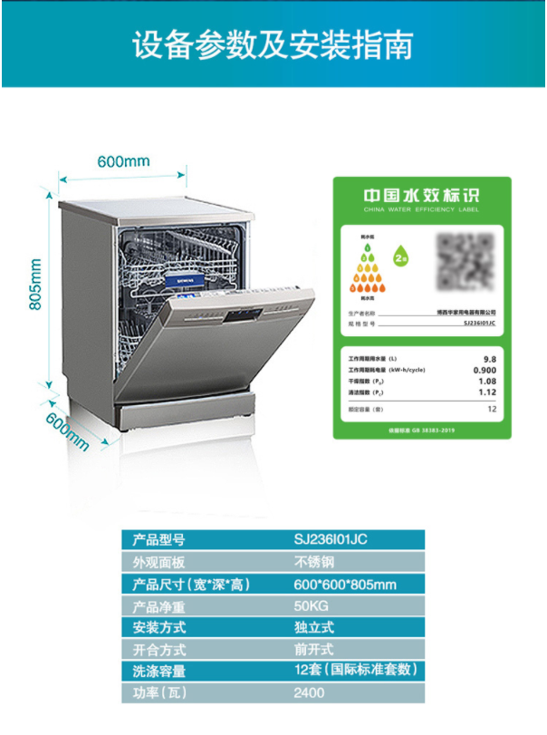 商品名称:西门子(SIEMENS) 12套大容量 独立式洗碗机家用 安装灵活 加强除菌 双重烘干 多人口家庭适用 SJ236I01JC 商品编号:185199 品牌:西门子 上架时间:2021-10-13 商品毛重:0克