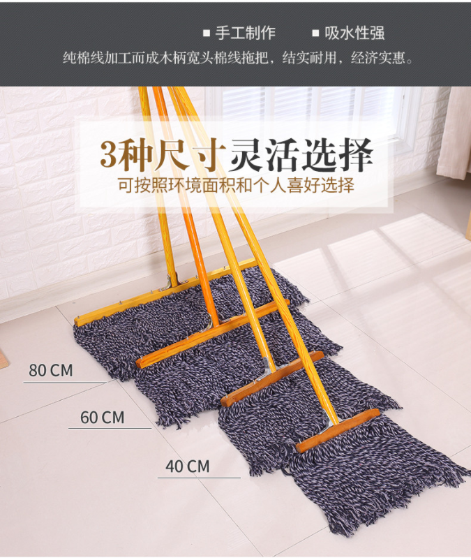 商品名称:工厂平板拖把 老式木杆棉线墩布 商用棉纱瓷砖拖水地拖普通尘推拖把 木柄木质头40cm宽 商品编号:185412 品牌:安赛瑞 上架时间:2021-10-18 商品毛重:0克