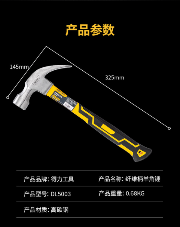 商品名称:得力(deli)纤维柄羊角锤铁锤子多用起钉锤铁榔头24oz DL5003 商品编号:185644 品牌:得力 上架时间:2021-10-23 商品毛重:0克