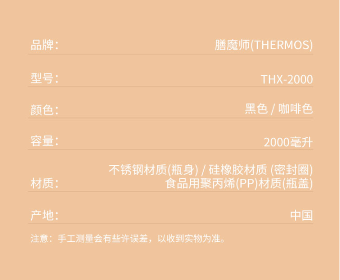 商品名称:THERMOS膳魔师保温壶2000ML高真空不锈钢商务家用大容量热水壶THX-2000 BK 商品编号:185755 品牌:膳魔师 上架时间:2021-10-25 商品毛重:0克