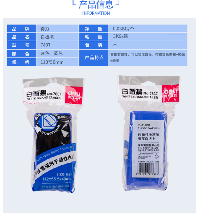 商品名称:得力(deli) 112*55*40mm白板磁性白板擦背面吸附黑板擦 颜色随机白板配件 白板笔 可用7837 商品编号:186145 品牌:得力 上架时间:2021-11-02 商品毛重:0克