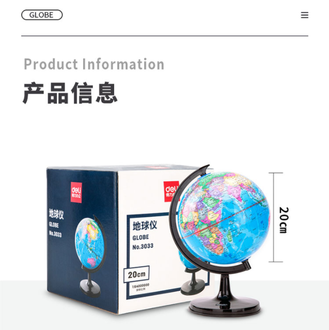 商品名称:得力(deli)Ф20cm学生自用办公地球仪 教学研究摆件 教学用品 3033