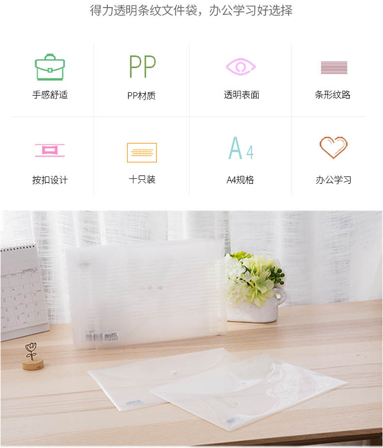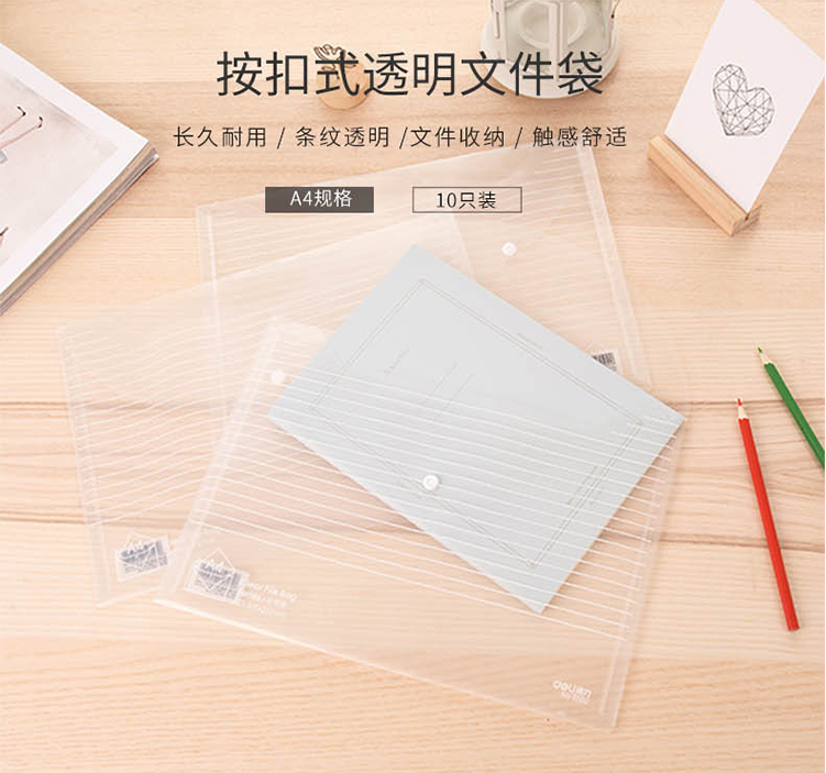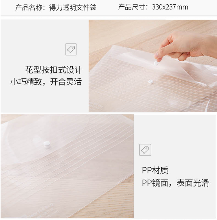 商品名称:得力(deli)1只A4加厚透明文件袋 5502 商品编号:186370 品牌:得力 上架时间:2021-11-06 商品毛重:0克