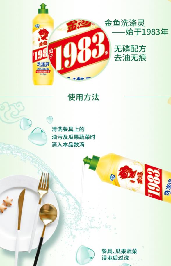 商品名称:金鱼洗洁精洗涤灵整箱装 中性食品级蔬果清洗剂洗碗液去油污护手不伤手温和洗洁精洗碗液整箱装 经典洗涤灵500g*24瓶/箱 商品编号:186416 品牌:金鱼 上架时间:2021-11-06 商品毛重:0克