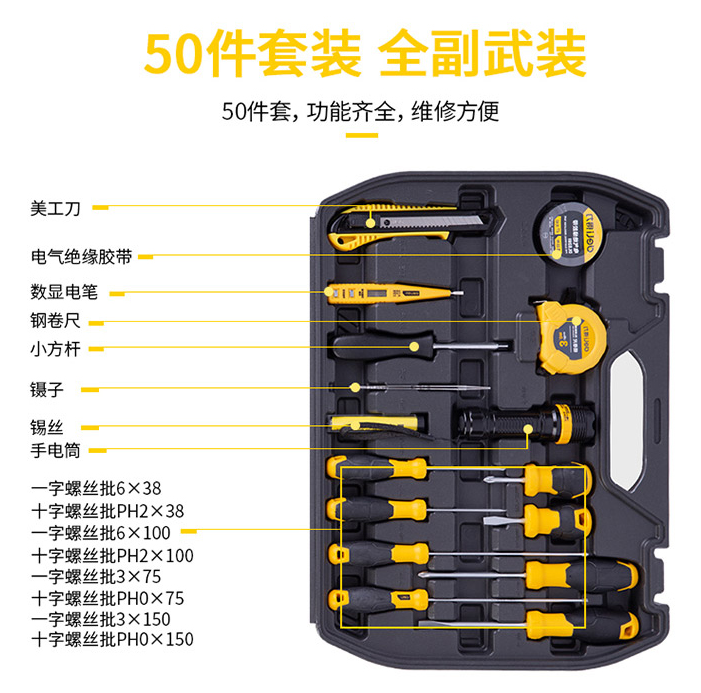 商品名称:得力(deli) 家用多功能五金工具箱手动工具组套 电工木工电讯汽车维修套装50件 DL1050 商品编号:186946 品牌:得力 上架时间:2021-11-17 商品毛重:0克