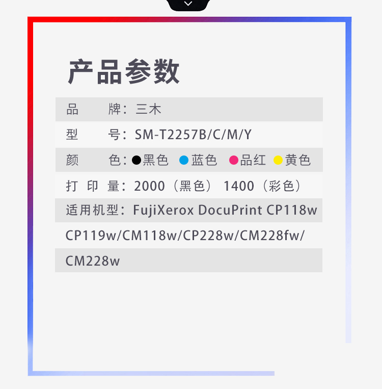 商品名称:三木(SUNWOOD) SM-T2260Y 黄色 粉盒 适用于FujiXerox DocuPrint CP118w/CP119w/CM118w/CP228w/CM228fw/CM28w 商品编号:187223 品牌:三木 上架时间:2021-11-23 商品毛重:0克