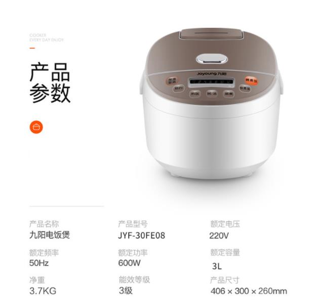商品名称:九阳(Joyoung)电饭煲 电饭锅 3L 3-4人迷你家用饭煲 智能预约一键快饭不粘内胆 JYF-30FE08 商品编号:187382 品牌:九阳 上架时间:2021-11-27 商品毛重:0克