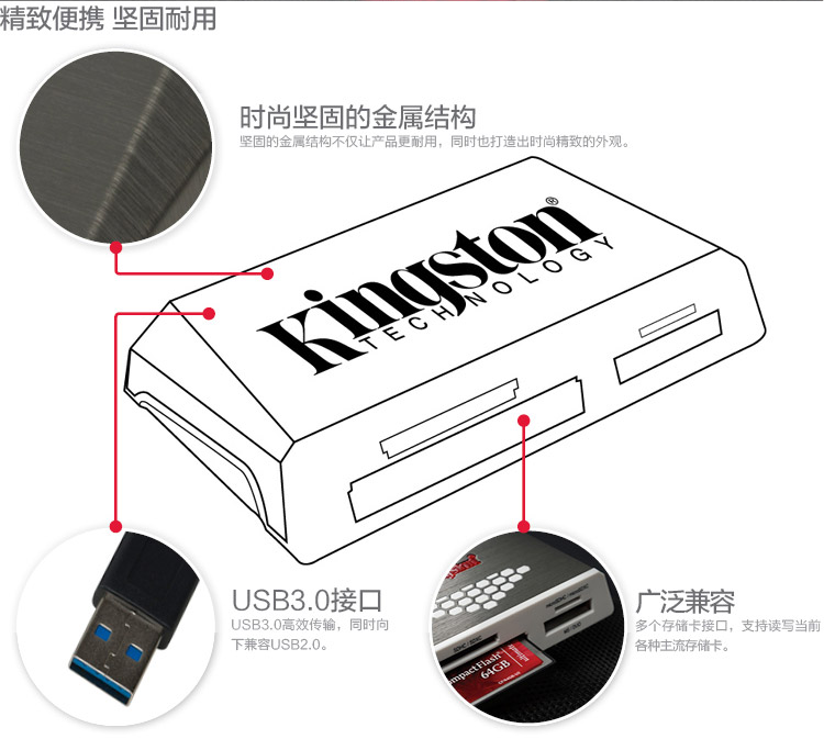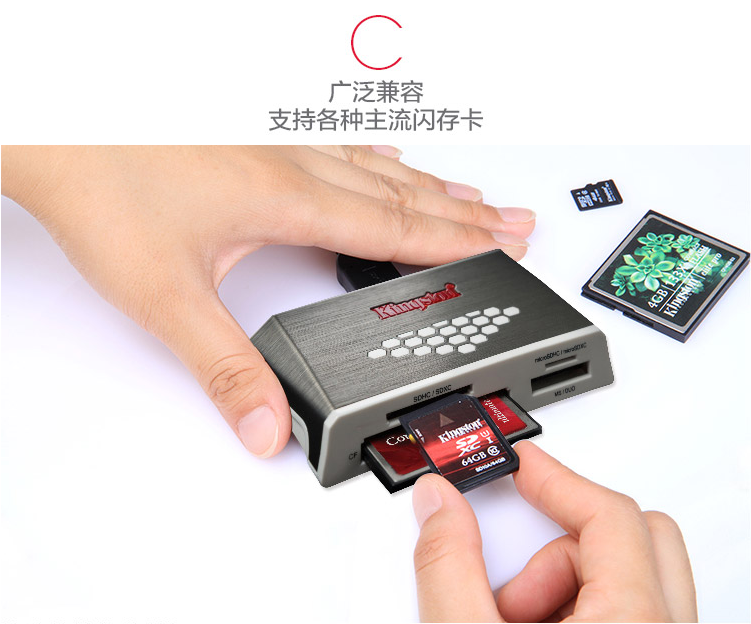 商品名称:金士顿(kingston)USB 3.0 High-Speed Media Reader 多功能读卡器(FCR-HS4) 商品编号:187467 品牌:金士顿 上架时间:2021-11-30 商品毛重:0克