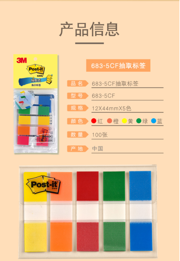 商品名称: 3M 便签 报事贴便利贴便签纸透明指示标签 办公用品 683-5CF(5色装) 商品编号:187773 品牌:3M 上架时间:2021-12-10 商品毛重:0克