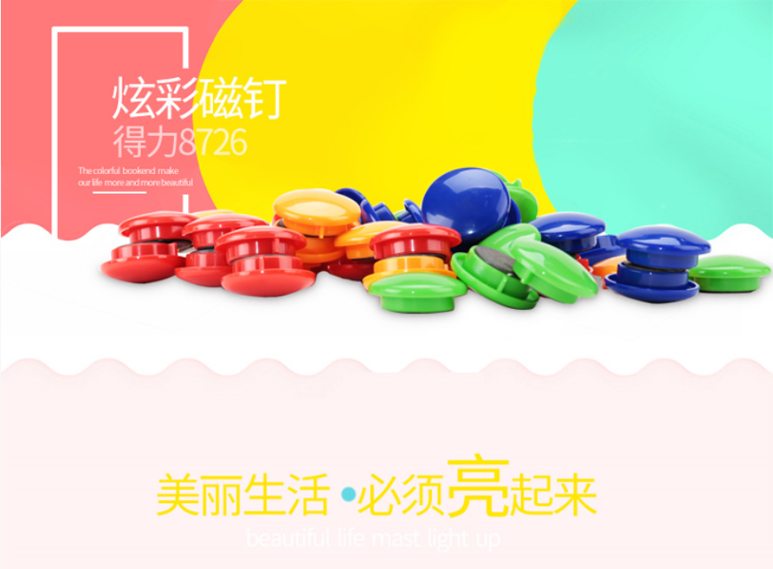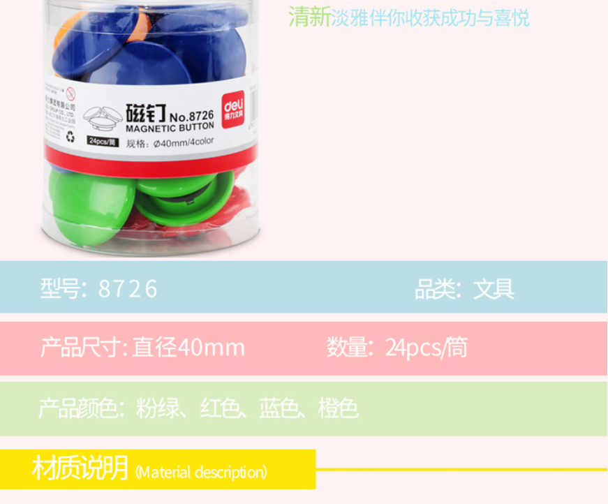 商品名称:得力 8726白板磁钉Ф40mm(混) 商品编号:188685 品牌:得力 上架时间:2022-01-18 商品毛重:0克