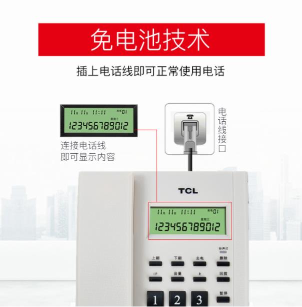 商品名称:TCL 电话机座机 固定电话 办公家用 双接口 来电显示 免电池 HCD868(79)TSD经典版 (雅致白) 商品编号:188775 品牌:TCL 上架时间:2022-01-21 商品毛重:0克