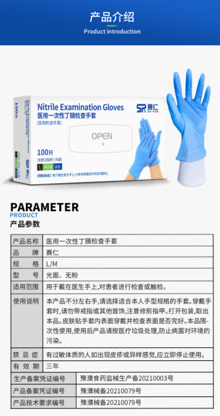 商品名称: 赛仁 医用一次性丁腈检查手套 医用防护手套L码 100只/盒 商品编号:188870 品牌:赛仁 上架时间:2022-01-26 商品毛重:0克