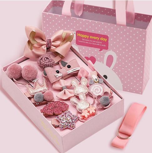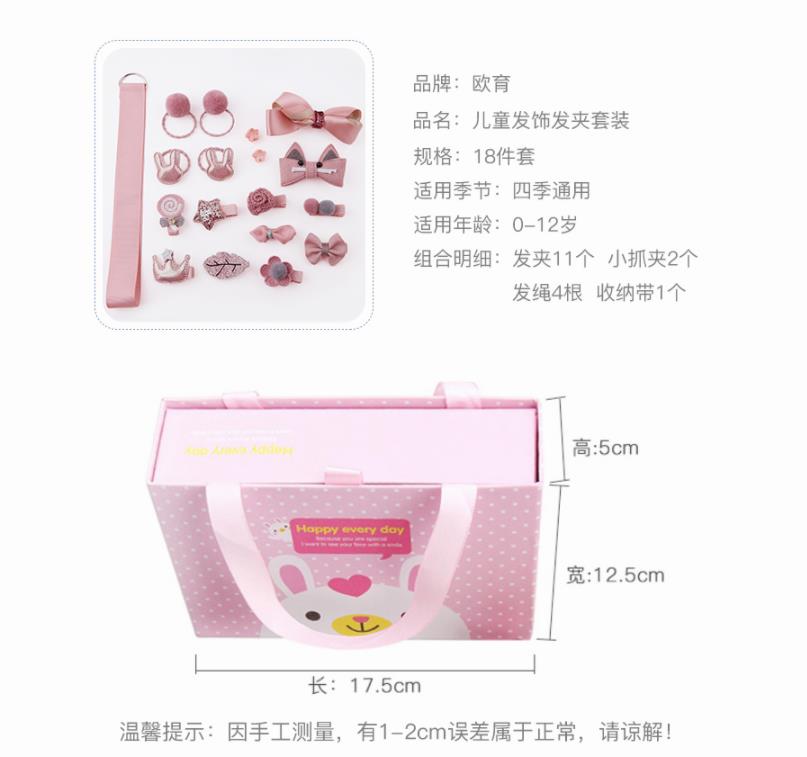 商品名称:欧育 儿童发饰礼盒女童发夹18件套B1073韩粉色 商品编号:189045 品牌:欧育 上架时间:2022-02-11 商品毛重:0克