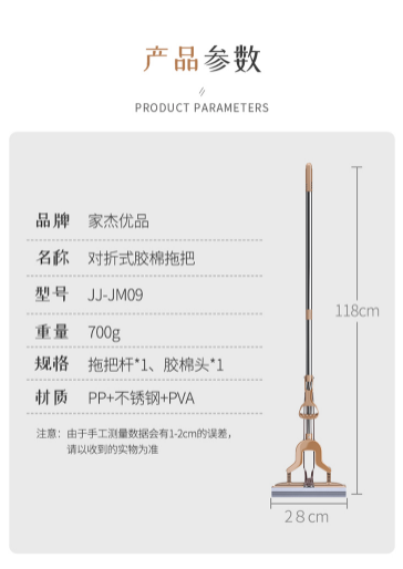 - 商品名称:家杰优品 28CM胶棉拖把 对折式吸水海绵拖布 干湿两用 免手洗懒人地拖墩布 JJ-JM09