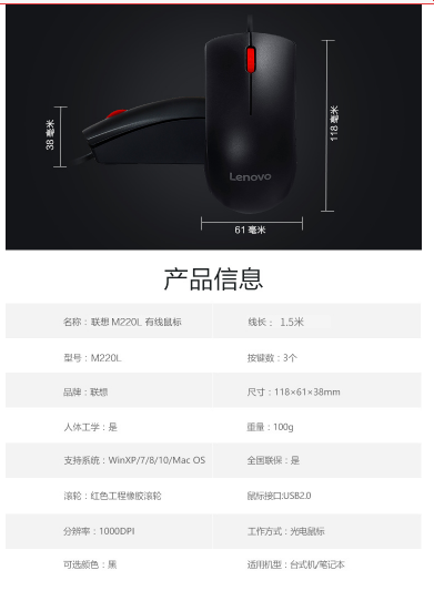- 商品名称:联想(Lenovo)鼠标 有线轻音鼠标 办公鼠标 大红点M220L有线轻音鼠标 台式机鼠标 笔记本鼠标