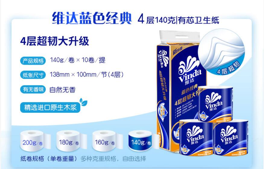 - 商品名称:VD 维达(Vinda) 蓝色经典140克*10卷 卫生卷筒纸
