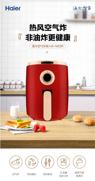 商品名称:海尔(Haier) HA-M03R 空气炸锅 商品编号:190831 品牌:海尔 上架时间:2022-04-15 商品毛重:0克