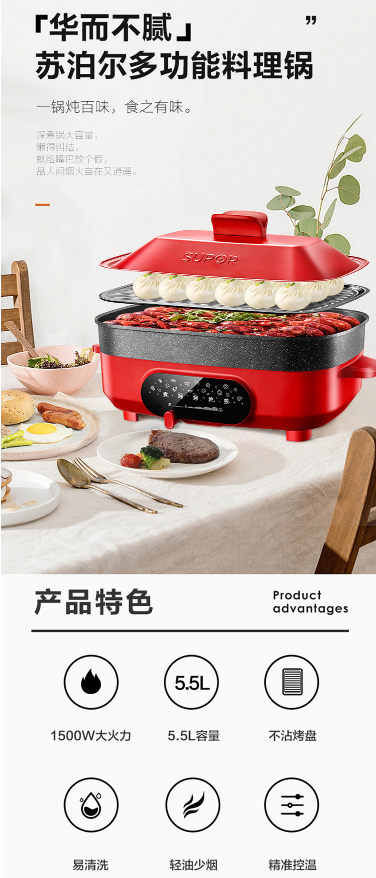 商品名称:苏泊尔 SUPOR多用途锅电火锅家用5.5L电蒸锅煎烤机多功能网红锅 JD3424D808 商品编号:191281 品牌:苏泊尔 上架时间:2022-04-22 商品毛重:0克