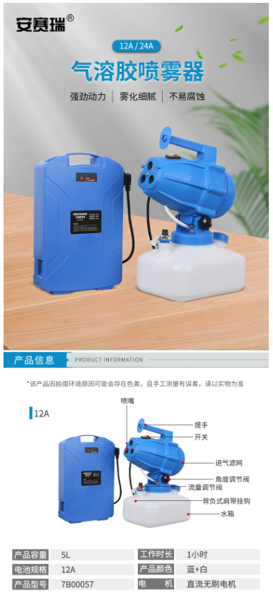 商品名称:安赛瑞 气溶胶喷雾器 手持电动喷雾器 医院弥雾机5L 三孔 24V 12A 商品编号:192433 品牌:安赛瑞 上架时间:2022-05-19 商品毛重:0克