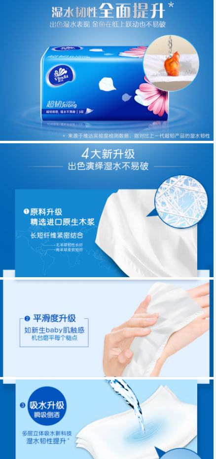 商品名称:维达(Vinda) 抽纸纸巾 超韧3层150抽*3包 商品编号:193802 品牌:维达 上架时间:2022-06-30 商品毛重:0克