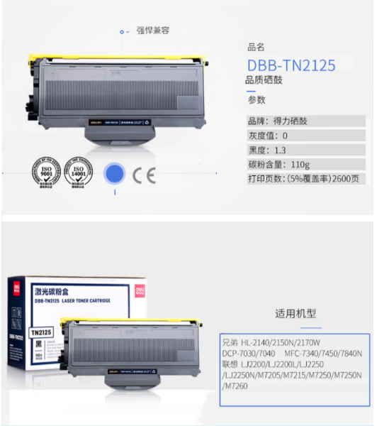 商品名称:得力(deli)DBB-TN2125 黑色碳粉盒(适用兄弟 2140/2150N/7030 MFC7340/7450)打印机粉盒 商品编号:193870 品牌:得力 上架时间:2022-06-30 商品毛重:0克